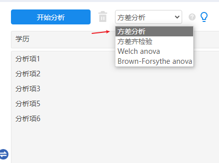 - 如果说某类别的数据标准差为0为null值,此时进行方差分析或方差齐检验,Welch方差或Brown-Forsythe方差时,均可能导致计算不出相关指标。建议分析前先使用数据处理->数据编码功能对组别进行合并,然后再进行分析。