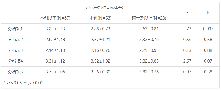 | 分析项1 | 3.23±1.33 | 2.88±0.73 | 2.63±0.81 | 3.73 | 0.03* |