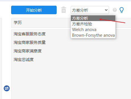 - 从理论上讲,方差分析有两个前提条件,一是因变量Y需要满足正态性要求,二是满足方差齐检验。如果不满足,此时可使用【通用方法->非参数检验】进行研究差异性。也有文献提及可将数据进行转换后使其更加接近或符合正态性,然后继续使用方差分析,用户可尝试进行数据转换【数据处理->生成变量】功能,一般是对数据进行比如求对数,开根号等处理。理论上的正态分布并不存在,数据接近于正态分布更符合实际情况,因此接近正态分布的数据直接使用方差分析即可。