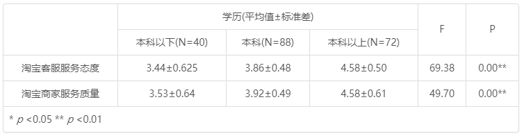 - 不同学历人群对于““淘宝商家服务质量”” 呈现出0.01水平的显著性差异(F