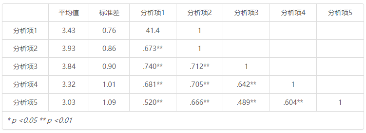 | 分析项5 | 3.03 | 1.09 | .520** | .666** | .489** | .604** | 1 |