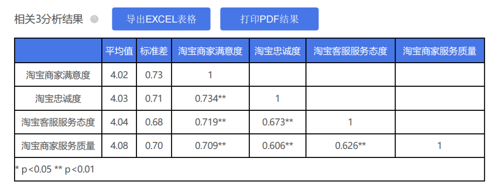 - “淘宝商家满意度”分别与“淘宝客服服务态度”,“淘宝商家服务质量”之间均呈现出显著性(p