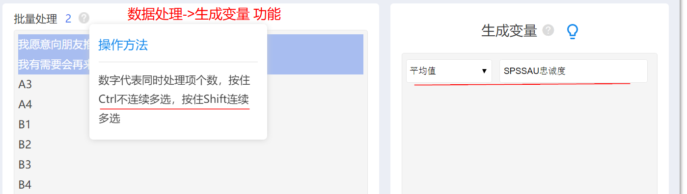 - 比如有两个题“我愿意向朋友推荐SPSSzero”,“我有需要会再来使用SPSSzero”,此两个题是“忠诚度”的体现。可使用SPSSzero【数据处理->生成变量(平均值)】功能完成。通常将多个题概括成一个整体之后,则可以进行相关分析、回归分析、方差分析等(以整体进行,而不需要以题项分别进行)。
