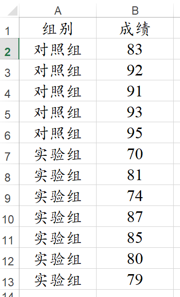 - 一定有1列表示叫‘组别’,而且里面只能为2种文字(或2个数字)。这样X就是‘组别’,Y是‘成绩’。