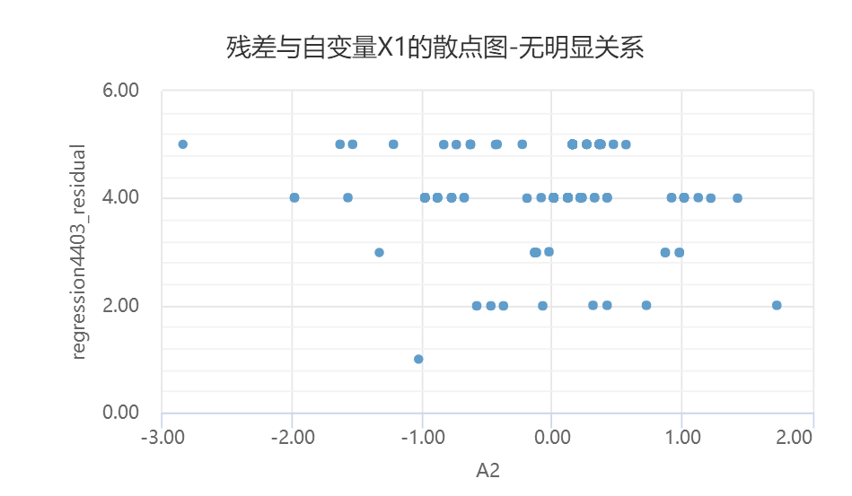 - 上图是回归分析保存的残差值与自变量作散点图,用于检测异方差性,上图可以看出,数据基本上没有规律可循,X变化时,Y并不会变大或者变小,因而说明无关联性,也即说明没有异方差性。