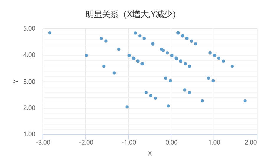 - 上图可以看出,X增大时,Y会明显的减少,也即说明X和Y之间有着负向相关关系。