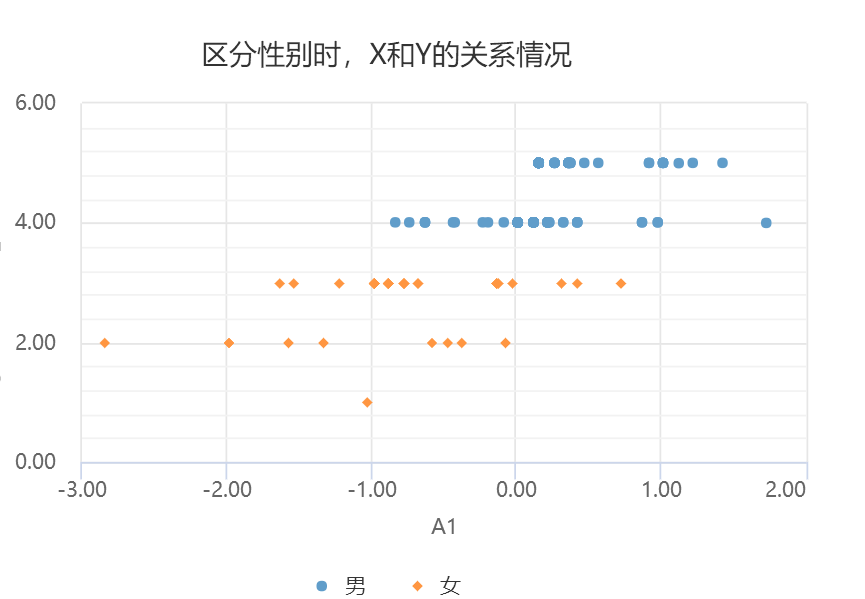 - 上图区分不同性别群体时,X和Y的散点图。需要让性别放入“颜色区分项”框即可,可直观展示不同类别时,数据间的关系差异情况。