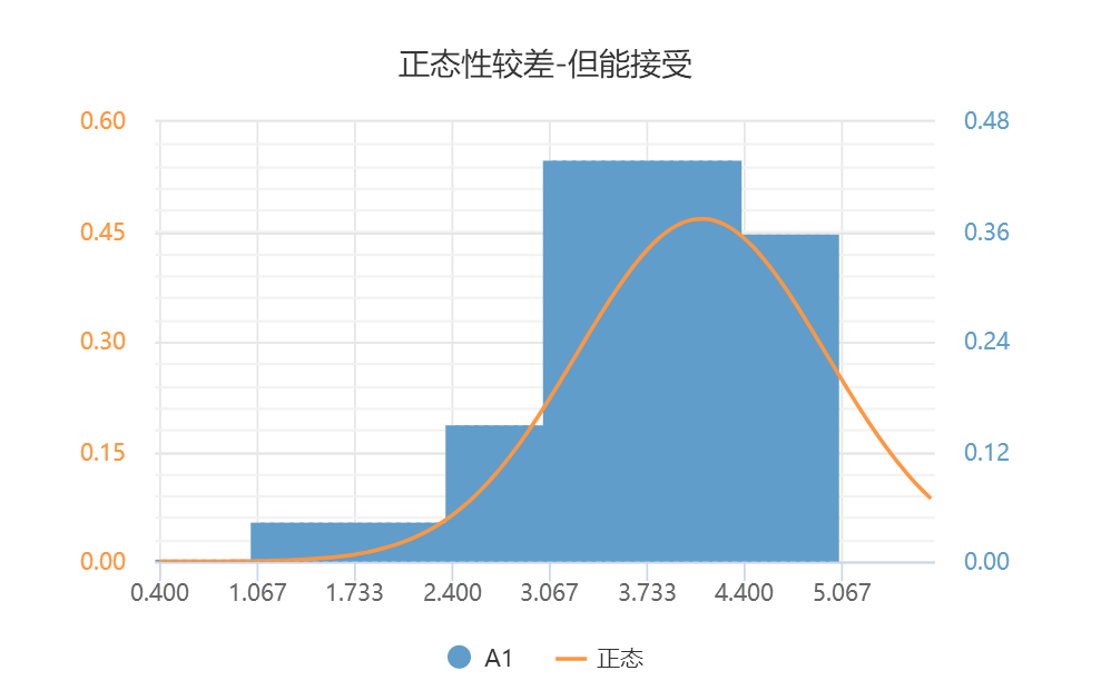 - 上图可以看出,数据离正态性较差,柱子的轮廓也有一定的钟形特征,但并不完美,如果数据量较少或要求不高,也基本上可以接受这样的正态性特质。