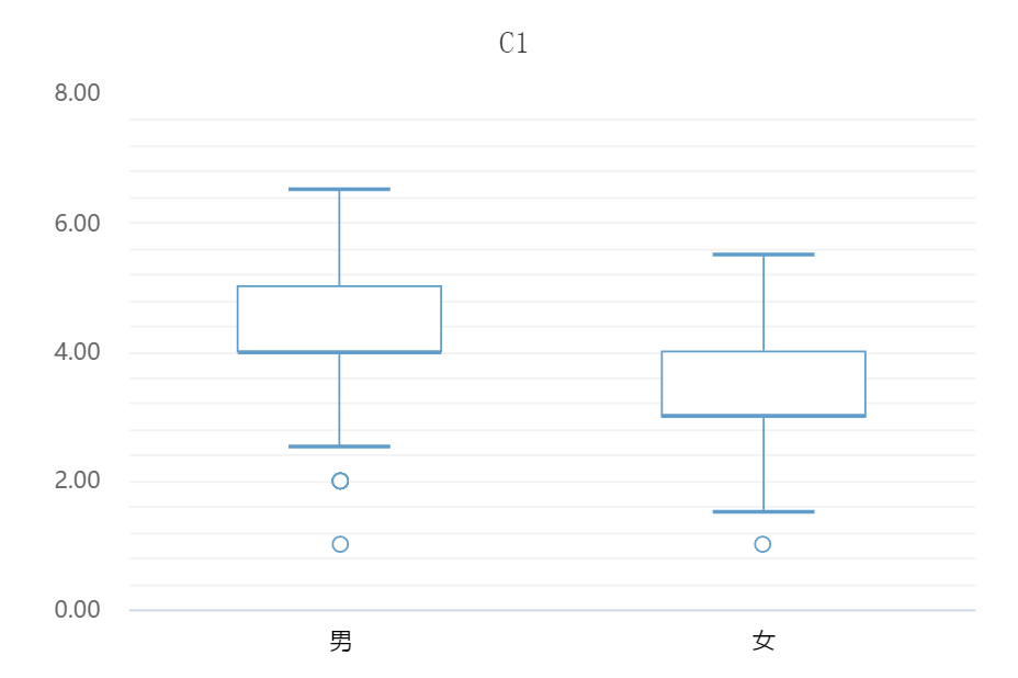 - 除了异常值的观察,还可以通过数据箱线图直观看出,男性在C1上的整体打分,会明显高于女性打分。