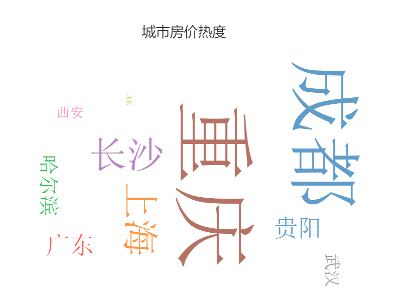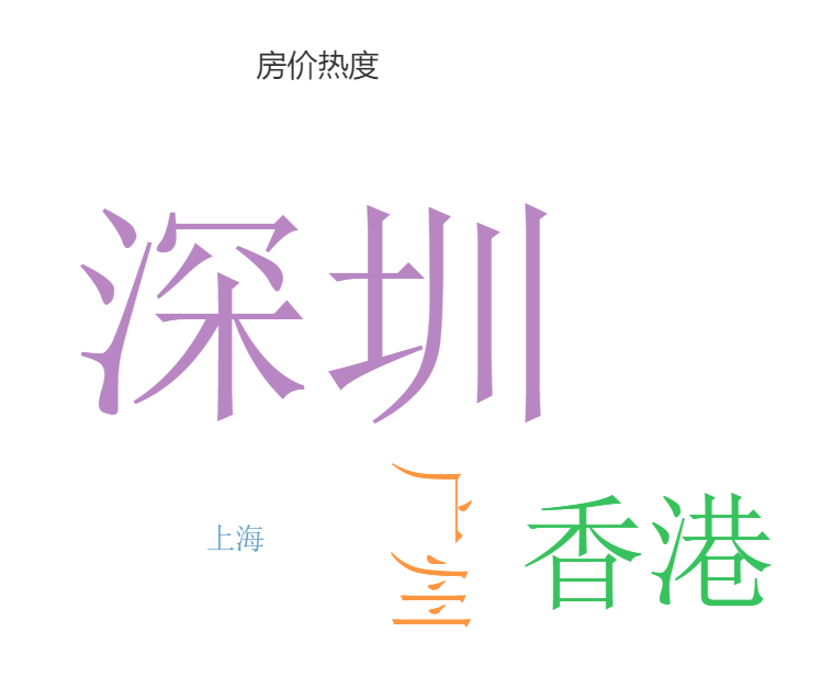 • 上图中直观展示出房价热度的情况,“深圳”字体最大最明显,直观展示出此信息。