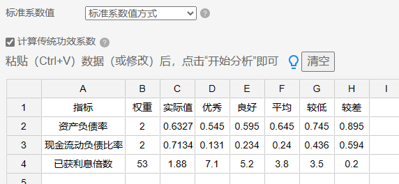 - 功效系数的基本要求是比如:越优秀那么其分值越大,也或者越优秀分值越低。如果出现数据不是这种递增或者递减的情况,SPSSzero 会进行排查和提示反馈。