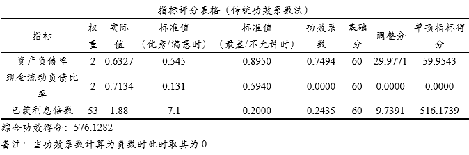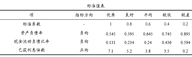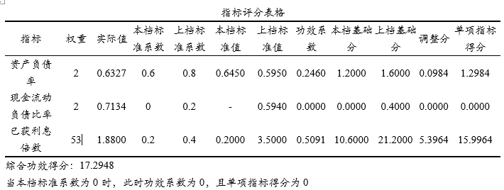 上表格展示出核心计算结果,比如资产负债率为负向指标,其实际值为0.6227(介于标准值为良好~平均,即0.745~0.645之间),因而其对应的本档标准系数值为0.6,上档标准系数为0.8,本档标准值为0.6450,上档标准值为0.5950。