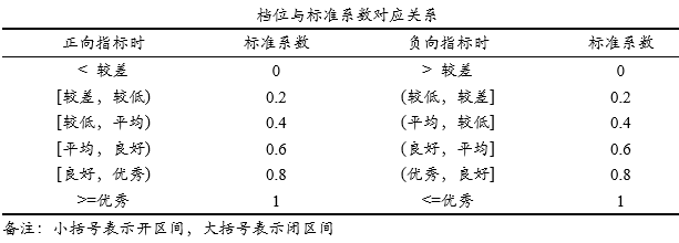 | --- | --- | --- | --- | | < 较差 | 0 | > 较差 | 0 | | [较差,较低) | 0.2 | (较低,较差] | 0.2 | | [较低,平均) | 0.4 | (平均,较低] | 0.4 | | [平均,良好) | 0.6 | (良好,平均] | 0.6 | | [良好,优秀) | 0.8 | (优秀,良好] | 0.8 | | >=优秀 | 1 | <=优秀 | 1 |