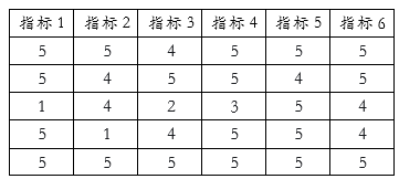 表格中数据展示打分数据,共有5个专家,因而共有5行数据,一共6个指标共6列数据。表格中的数字1表示专家认为该指标最不适合,比如指标1时专家3打分仅为1分。当然5分代表专家最为认可该指标,通常情况下希望分值越高越好。