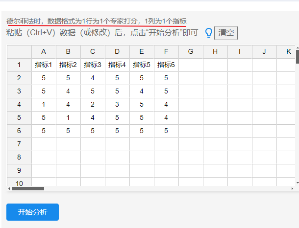 将打分数据粘贴(或编辑)到表格中,1行为1个专家,1列为1个指标,然后点击开始分析即可。