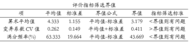 分别从平均值、变异系数和满分频率3个角度进行适用性判断后,最终进行综合判断。综合判断是指“如果3个指标均有问题则该指标应该删除,如果全部通过则保留,如果有1/2个有问题则应该综合取舍。”。比如指标1、指标2和指标3,该3个指标均有出现部分问题,因而应该综合实际情况进行取舍。但是指标4、指标5和指标6这3个,在平均值、变异系数和满分频率这3项上均正常,因而应该进行保留。