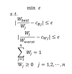 Wbest表示最好指标的权重,Wworse表示最差指标的权重,Wj表示某指标权重,cBj表示第j个指标BO时的数据,cWj表示第j个指标OW时的数据,ε(eps)为误差,通常情况下希望该误差越小越好,越接近0越好(其实际意义为规划求解得到和实际情况的gap值)。从上述来看其思想是:本属于该重要性位置的指标,它也应该属于该重要的位置,这是BWM权重的思想意会。