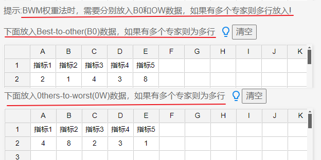 需要注意的是,SPSSzero 提供两个表格分别放BO和OW数据。以及如果有多个专家打分,那么比如BO数据就有多行,依次放入就好。与此同时,在计算结果输出时,1个专家对应着1份权重数据,多个专家就对应多份权重数据,因此结果中还会有多个专家权重的平均值即输出global权重值。