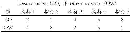 others-to-worst(OW)表示‘各指标与最差指标’的相对重要性,比如上表格中指标2对应的OW数据为8,其意味着‘指标2与最差指标’的相对重要性为8,如果8代表很重要,那么意味着‘指标2’相对于‘最差指标’,指标2很重要。