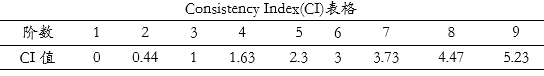 | Consistency Index(CI)表格 | 展示一致性指数CI值 |
