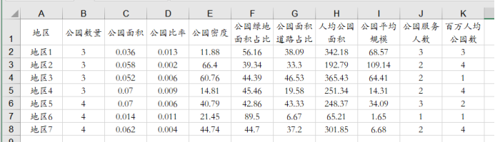 当前有7个公园,涉及3个准则层共计10个指标的数据,如下图所示: