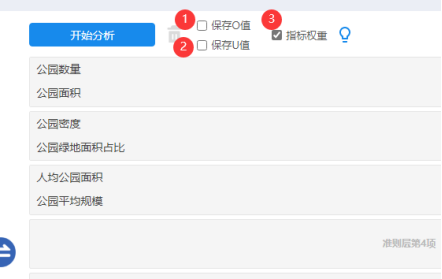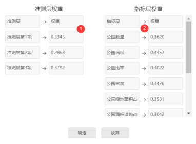- 如果说某个准则层下属的指标层权重加和不为1,此时SPSSzero 会自动对其归一化处理,保证某个准则层下属的指标层权重加和为1,比如上表格中‘准则层第1项’时对应3个指标分别是:公园数量、公园面积和公园比率,该3项的权重(0.3620、0.3357和0.3022)如果加和不为1,系统会自动归一化处理让其加和为1。