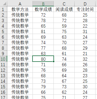 当前希望比较三种不同教学方法对学生学习效果的影响,即数据包括教学方法(传统教学、多媒体教学、小组合作),研究项分别是数学成绩(0-100分)、阅读成绩(0-100分)和专注时间(分钟),每组20个学生,共计20*3=60行数据,其数据格式类似下图: