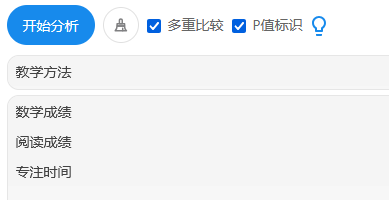 分别将教学方法放入X框,另外3项放入Y框中。并且默认选中‘多重比较’和‘P值标识’。