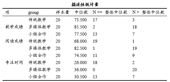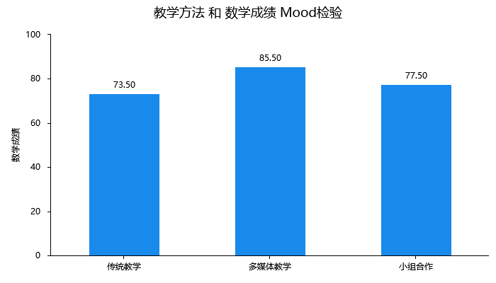 当前希望检验三种教学方法在数学成绩,阅读成绩和专注时间共3项上的中位数是否存在显著差异,以用于教育决策提供数据依据。本案例时,由于各组数据较少仅20个,因而数据较难呈现出正态性,而且成绩这类数据也有可能出现异常(比如某学生仅几分),与此同时,使用中位数来表示成绩等信息的整体水平情况也较为适合,因而使用Mood中位数检验较为适合。