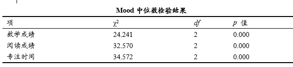 事后检验(多重比较)对比具体两两组别的差异性,需要注意的是,其前提是Mood检验呈现出显著性,比如本案例时数学成绩、阅读成绩和专注时间均呈现出显著性,因而可进一步使用‘多重比较’结果。上表格展示与各组别对应的中位数,以及中位数差值情况和统计量信息等。