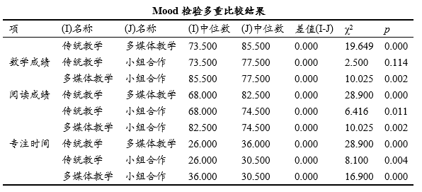 具体多重比较时,建议需要进行Bonferroni校正,比如显著性水平为0.05,并且两两比较次数为3次,那么Bonferroni校正显著性水平为0.05/3次=0.0167,即p 值需要与0.0167进行对比,而不是0.05;具体来看,比如传统教学与多媒体教学的中位数分别是73.5和85.5,并且p 值为0.000,多数情况下该p 值应该与0.05(即0.05水平)进行对比,但Bonferroni校正时,显著性水平是0.05,但对比的p 值应该与0.05/3次=0.0167,在本例子中,Bonferroni校正差异对比时与0.0167对比(基于0.05显著性水平前提下),也依旧呈现出显著性。