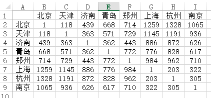 当前有中国有8大核心城市的距离数据,希望使用多维尺度法直观展示该8大城市的距离情况,数据如下图所示:
