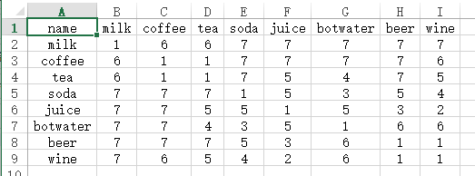 如果研究的是‘饮料口味相似度’,类似下图这样的nn结构数据,数字代表的距离只是一种‘次序’非实际距离(比如coffee和milk之间的数字为6代表距离较远,但beer和wine之间的数字为1代表距离非常近),此类数据一般使用‘非度量MDS’法,数据格式为nn结构数据;