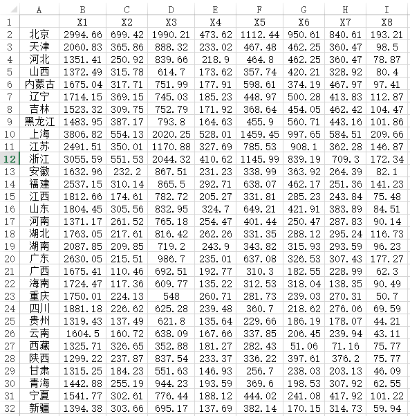 除此之外,还有一种数据为‘原始数据’格式,比如研究中国31省市在8个维度的消费情况,以便可视化呈现各省市居民的相似情况,如下图所示: