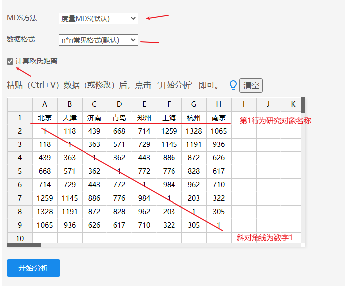 图中右下角数据为1,其代表自己,以及数据呈现出完全对称关系。上述数据中数字代表实际距离,因而应该使用‘度量MDS法’,并且数据格式为n*n格式。可选择‘计算欧氏距离’。