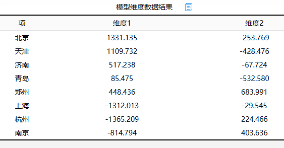 上表格展示MDS模型的基本设置,本次案例使用度量MDS法进行研究,输入数据为n*n格式,并且要求先计算欧式距离后再进入模型分析。