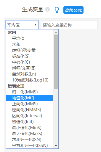 本案例数据中包括4个政务系统的评价指标,而且全部都是正向指标,因此不需要进行正向化或者逆向化处理。以及接着数据标准化解决量纲问题上,本例子使用‘均值化’处理方法。操作为数据处理->生成变量,如下图: