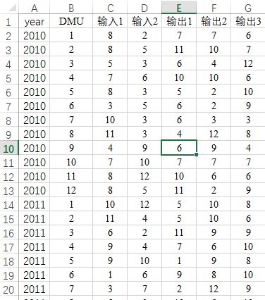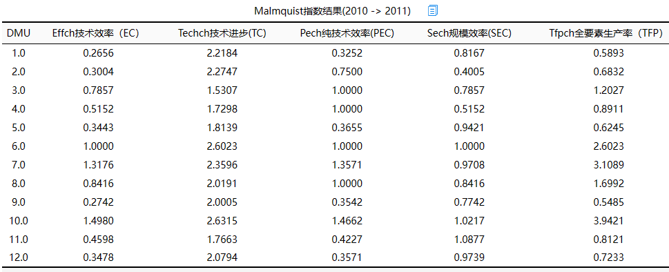 当前有一项效率数据研究,DMU为12项且为2010~2012共3年数据。希望通过malmquist指数研究跨期效率变化情况,部分数据如下图所示: