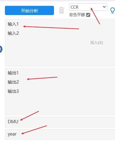 选择使用CCR模型,并且放入2个输入项和3个输出项。以及将DMU和Year项分别放入框中。需要注意的是,malmquist指数是针对面板数据进行,如果不是面板数据,系统会提示数据格式不正确,比如10个DMU,5年,那么一定是10*5=50行数据,并且每个DMU一定有相同的5个年份数据。